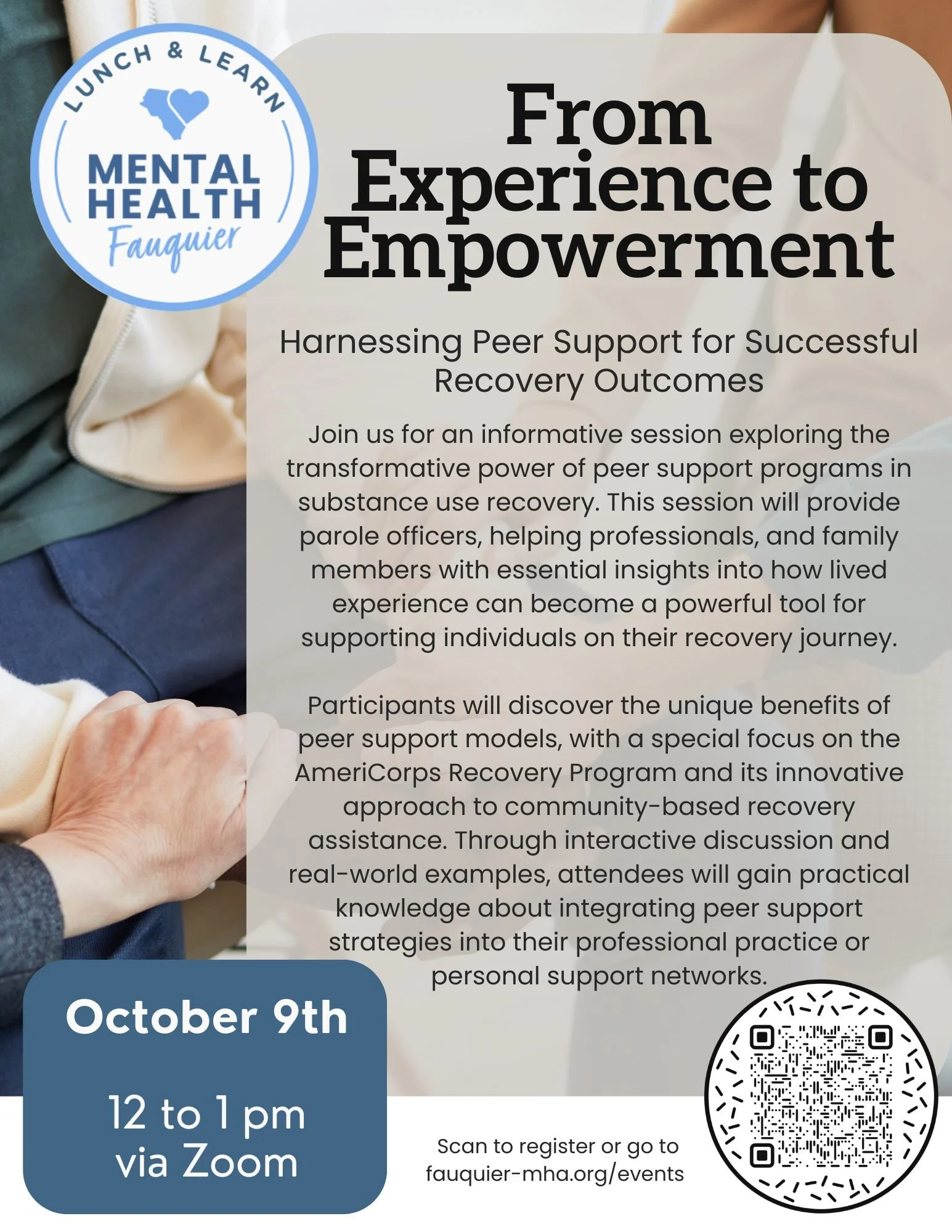 Join us for an informative Lunch & Learn session exploring the transformative power of peer support programs in substance use recovery. This session will provide parole officers, helping professionals, and family members with essential insights into how lived experience can become a powerful tool for supporting individuals on their recovery journey.